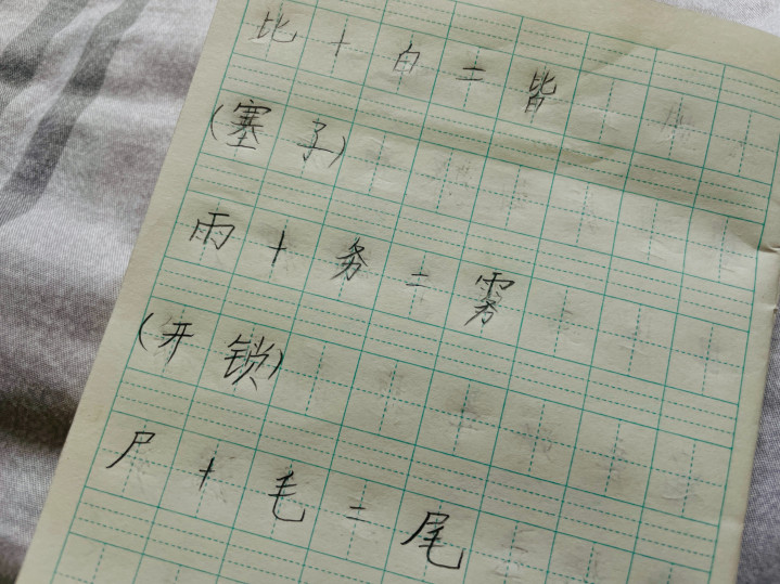 孩子竟然说:把字拆开,比+白=皆,雨+务=雾,尸+毛=尾。塞拆不开,就组词“塞子”,还有锁是“开锁”。